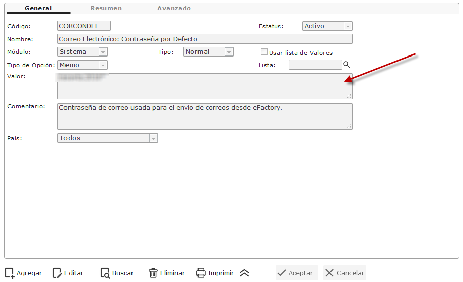 a. Al seleccionar "Opciones" se nos desplegara un formulario en el cual podremos ver las opciones predefinidas del sistema. Deberemos buscar las siguientes opciones (deberemos buscar por "Código" de opción):