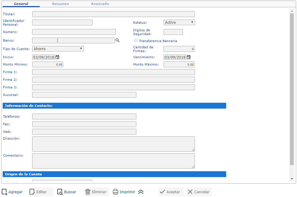 En el formulario de Cuentas Bancarias de Proveedores existen varias secciones como son las siguientes: