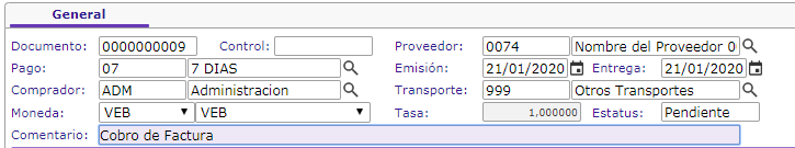 La sección General contiene todo la información asociado a la orden de compra. Los campos contenidos son los siguientes: