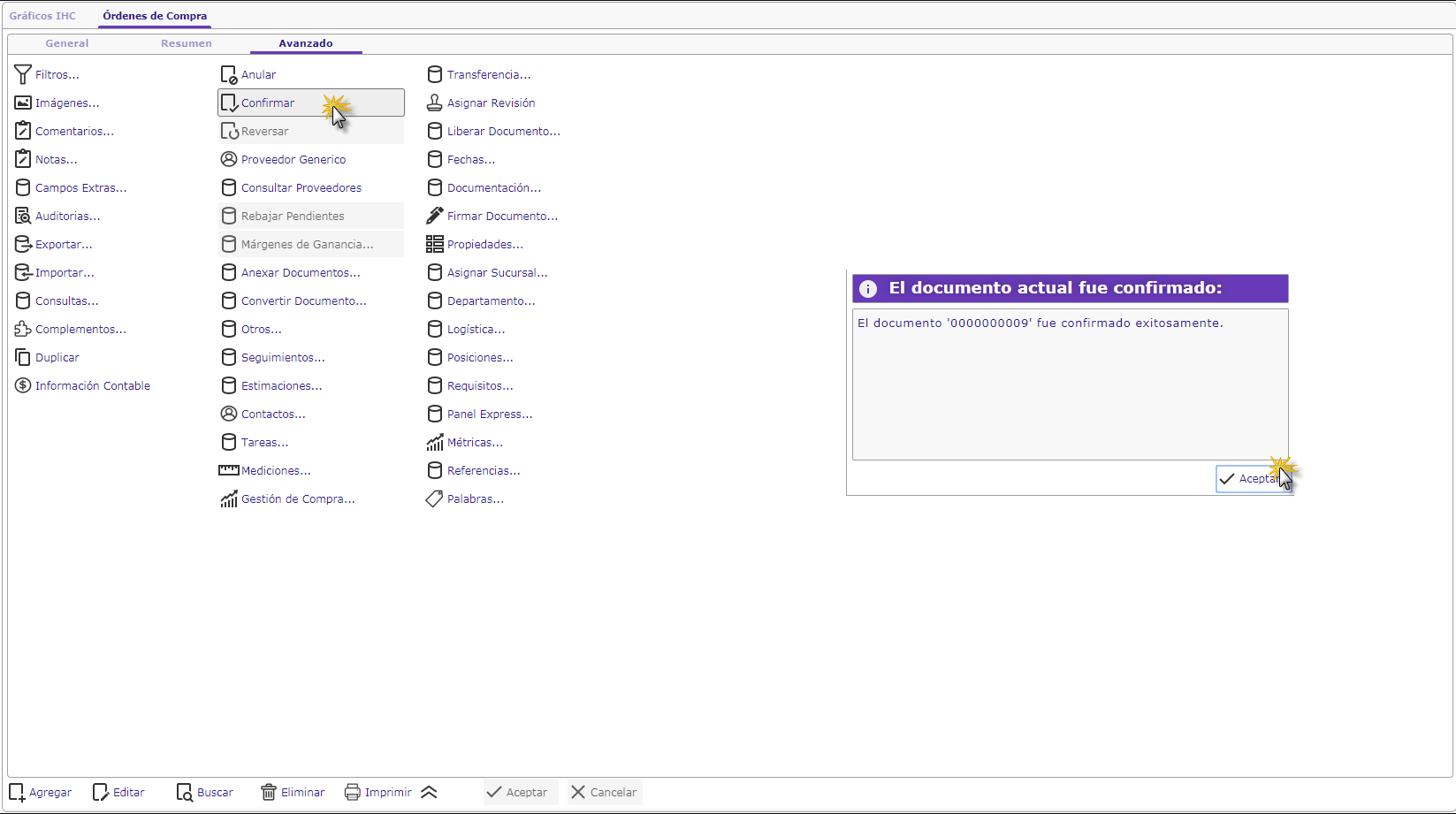 la orden llenada para luego confirmarla si todo esta bien. Para confimarla debe ir a la ficha Avanzado y seleccionar