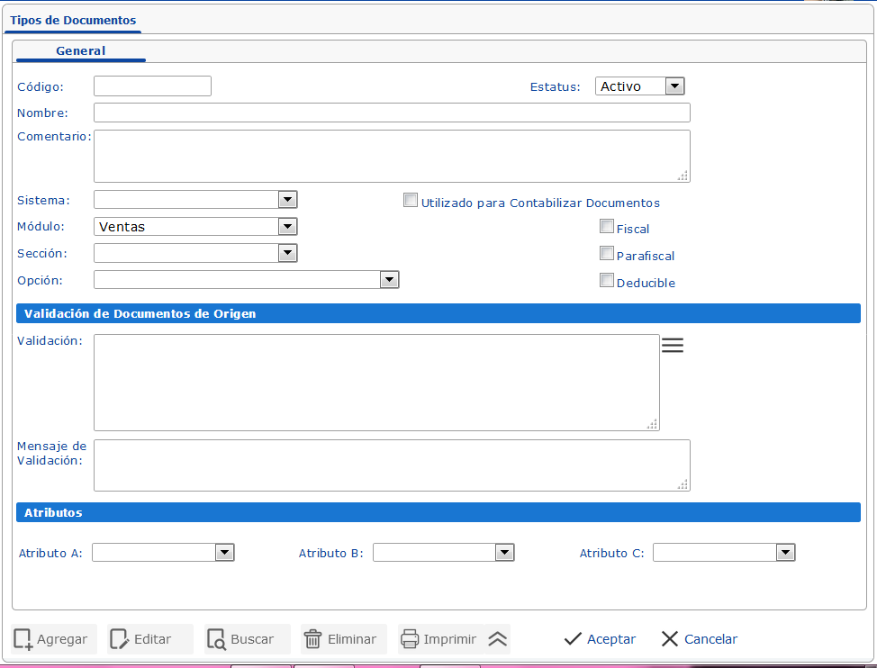 Esta opción le permite crear nuevos tipos de documentos también puedes buscar, modificar, y eliminar registros ya creados, haciendo uso de los botones ubicados en la parte inferior de la pantalla. El tipo de documento se asigna a la hora de registrar un asiento de forma manual en los comprobantes de diario. Los datos básicos que debes completar para crear un nuevo tipo documento son: Código, Nombre, Sistema, Módulo, Sección y Opción.