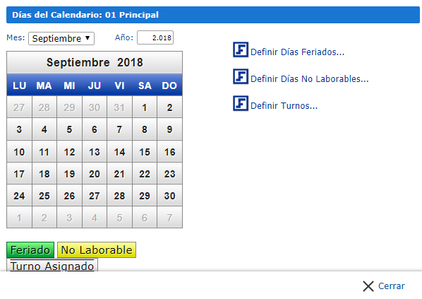 También se puede seleccionar un rango de fecha más amplia para configurar todo un año con los mismos valores, pulsando en las opciones Definir Días Feriados, Definir Días No Laborables, Definir Turnos.