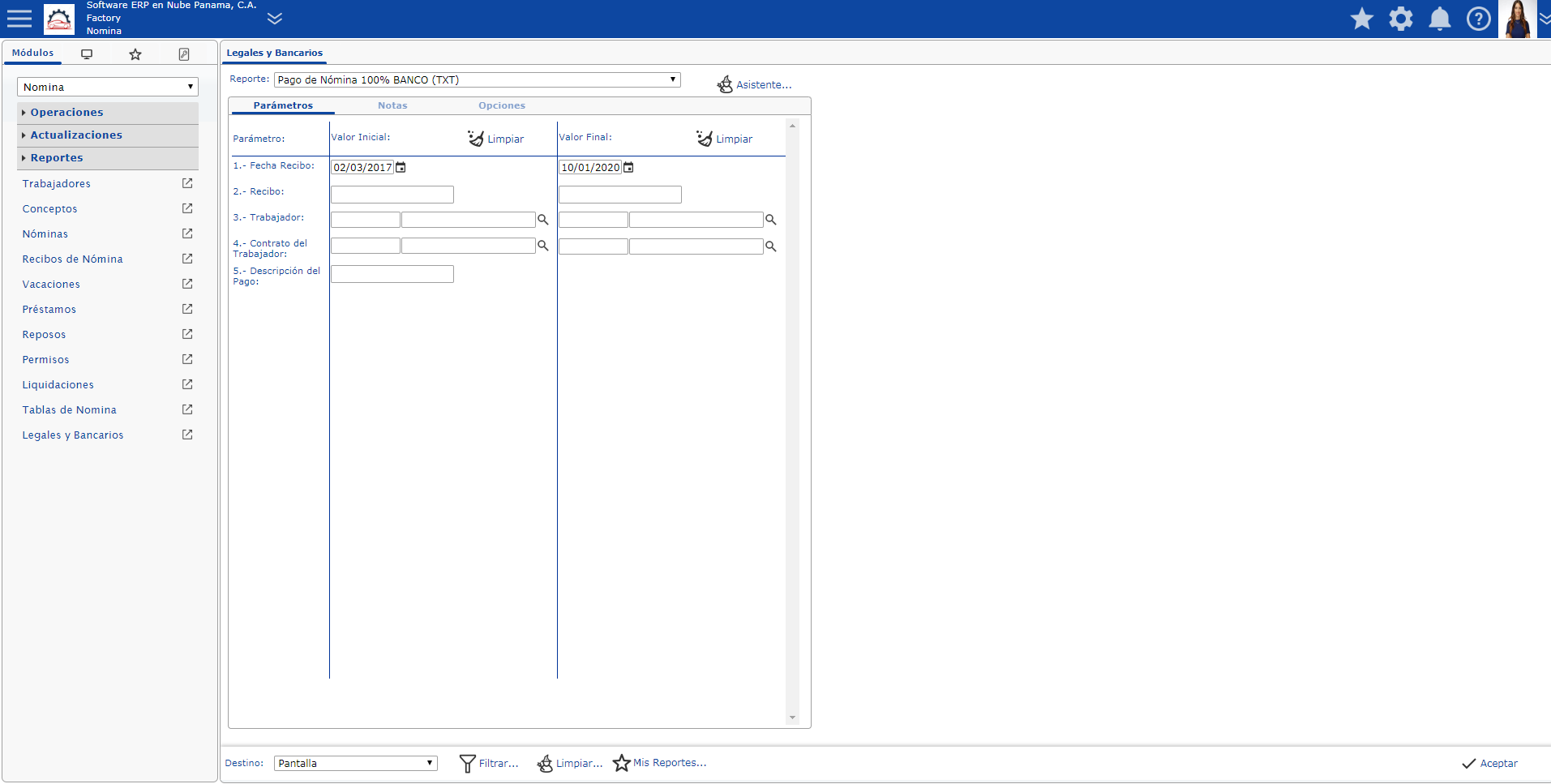 a. En la pantalla de Legales y Bancarios, en el menú desplegable debes seleccionar el reporte Pago de Nómina del banco con el que vayas a trabajar(100% Banco, Bancaribe, Banesco, BBVA, BOD, Provincial, Sofitasa). Allí aparecerá un formulario con los datos básicos que debes llenar para completar el pedido de nómina, este formulario varía dependiendo del banco que hayas seleccionado. Debes indicar el rango de fechas en la que quieres ver el pago de la nómina, también puedes aplicar algún otro filtro como: trabajador, contrato, entre otros (dependiendo del banco).