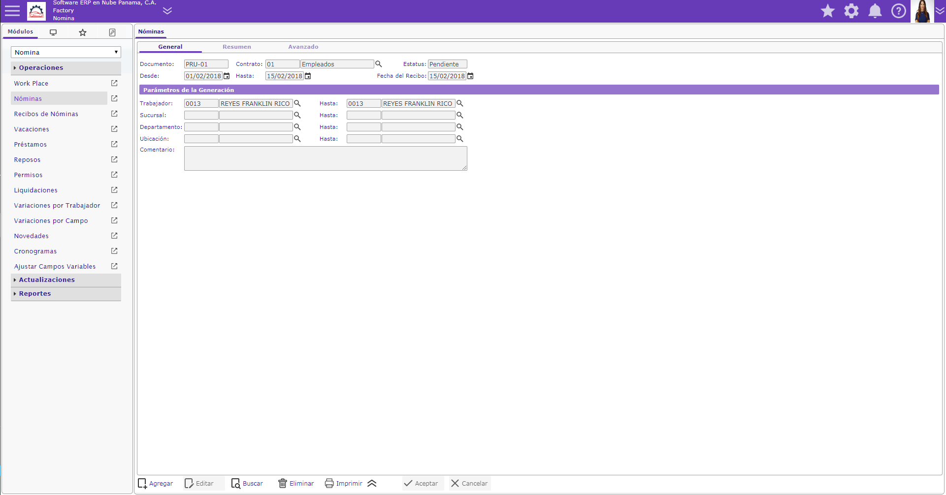 luego Seleccionamos el Módulo Nómina, Empresa y Sucursal de la Empresa y presionamos el botón
