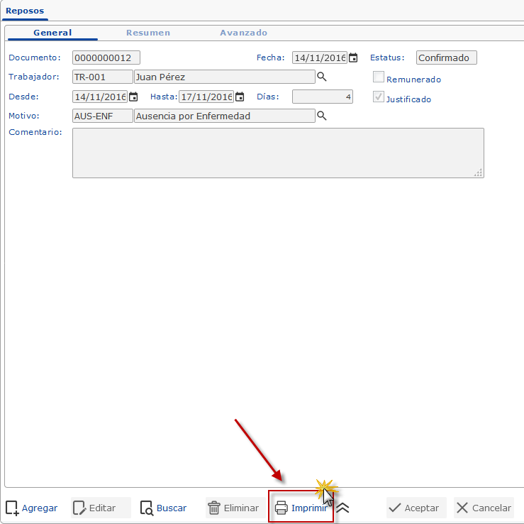 Los reposos representan la ausencia del trabajador por uno o más días, e indica las condiciones que dieron lugar a la ausencia. Este es usado en los contratos de sueldos y salarios cuando la ausencia no es remunerada o justificada, y esto implique una deducción en el sueldo a pagar.