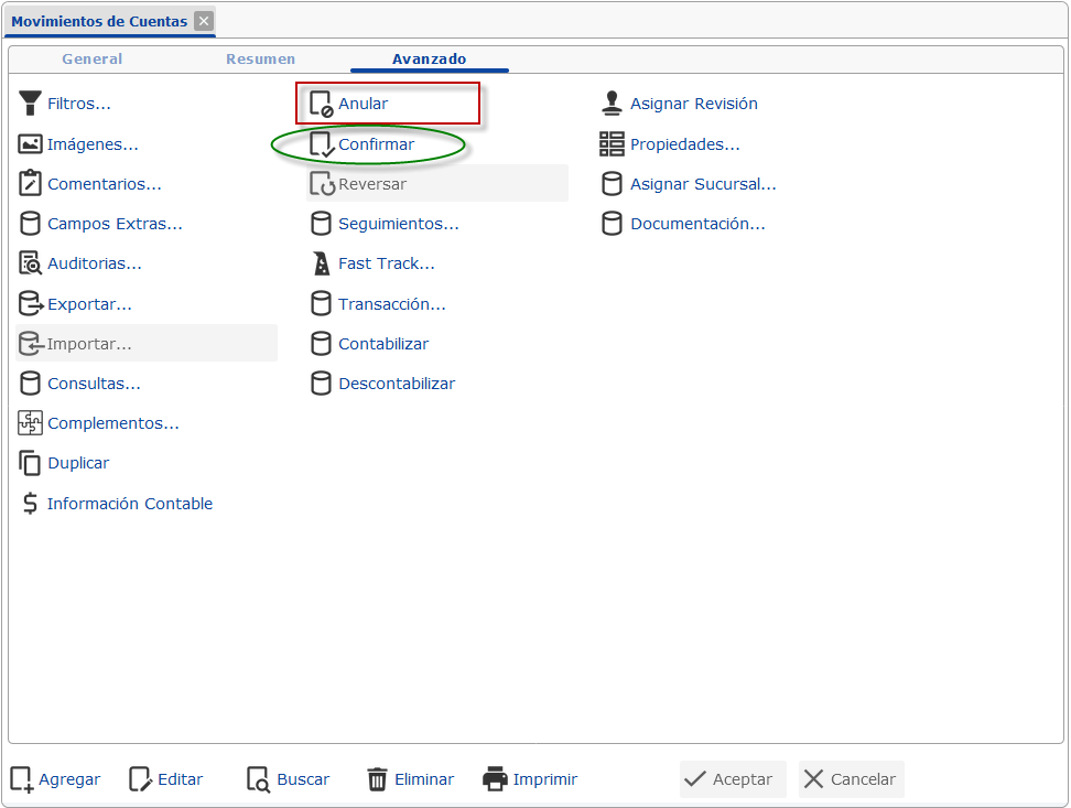 Por otro lado, en la ficha Avanzado puede ubicar el botón Anular para eliminar el movimiento caja si tuvó algún error.