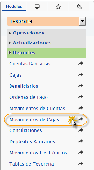 Lo primero que deberemos hacer es ingresar a nuestro sistema de administración con nuestro usuario y clave personal. Cuando ingresemos seleccionaremos el modulo de "Tesorería" y desplegaremos la sección de "Reportes" y presionaremos la opción de "Movimientos de Cajas".
