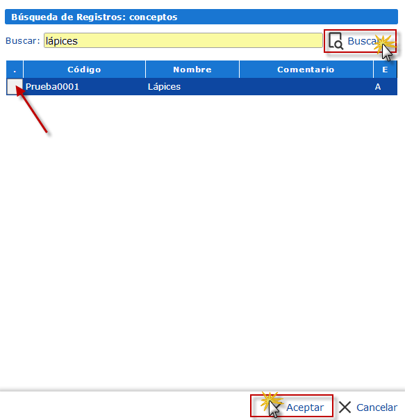 Si no posee registrado el presupuesto de algún concepto de la empresa entonces el primer paso a seguir es ingresar al módulo de Tesoreria, ir hasta a la pestaña Actualizaciones y seleccionar la opción Conceptos de Movimientos. En este panel observará el último concepto creado, si desea cambiar el presupuesto de algún otro podrá buscarlo haciendo click en el botón Buscar, ingresando alguna palabra clave sobre este y luego seleccionarlo.
