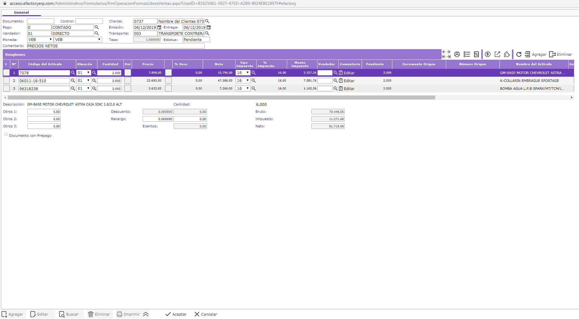 c. Luego se nos carga la ventana de Factura de Venta donde podremos agregar, y eliminar reglones y modificar los campos que se encuentren disponible a modificar, después de haber realizado todas estas operaciones se procede a seleccionar el botón