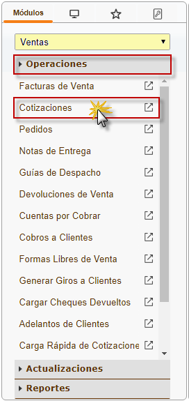 b. En el módulo Ventas, desplegamos el componente Operaciones y activamos el sub componente Cotizaciones