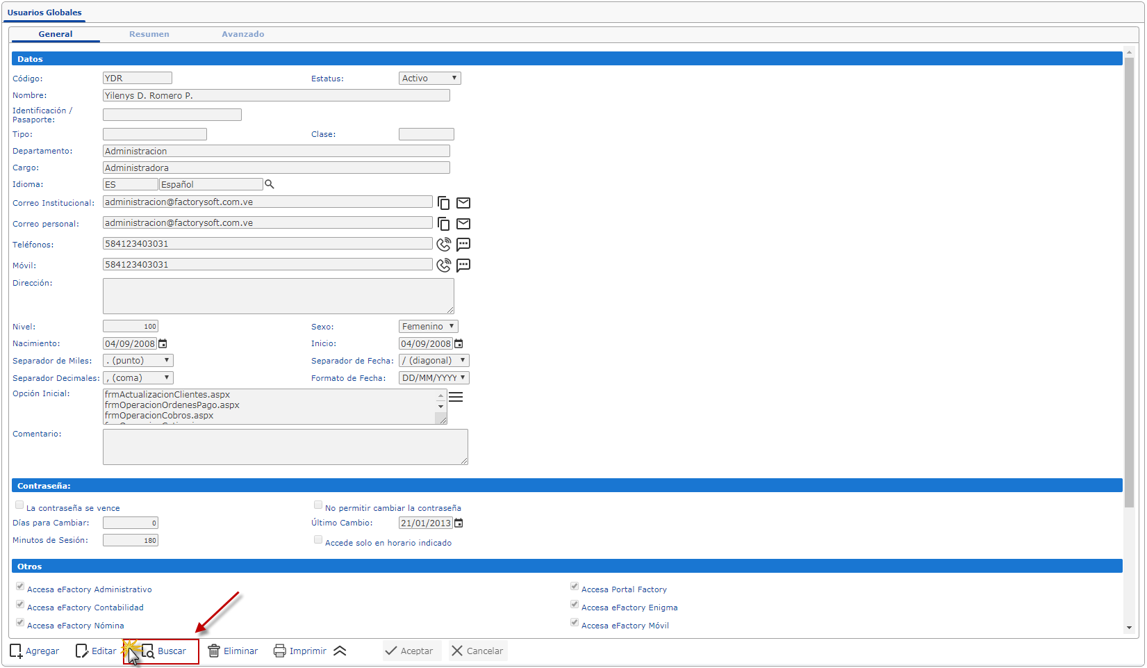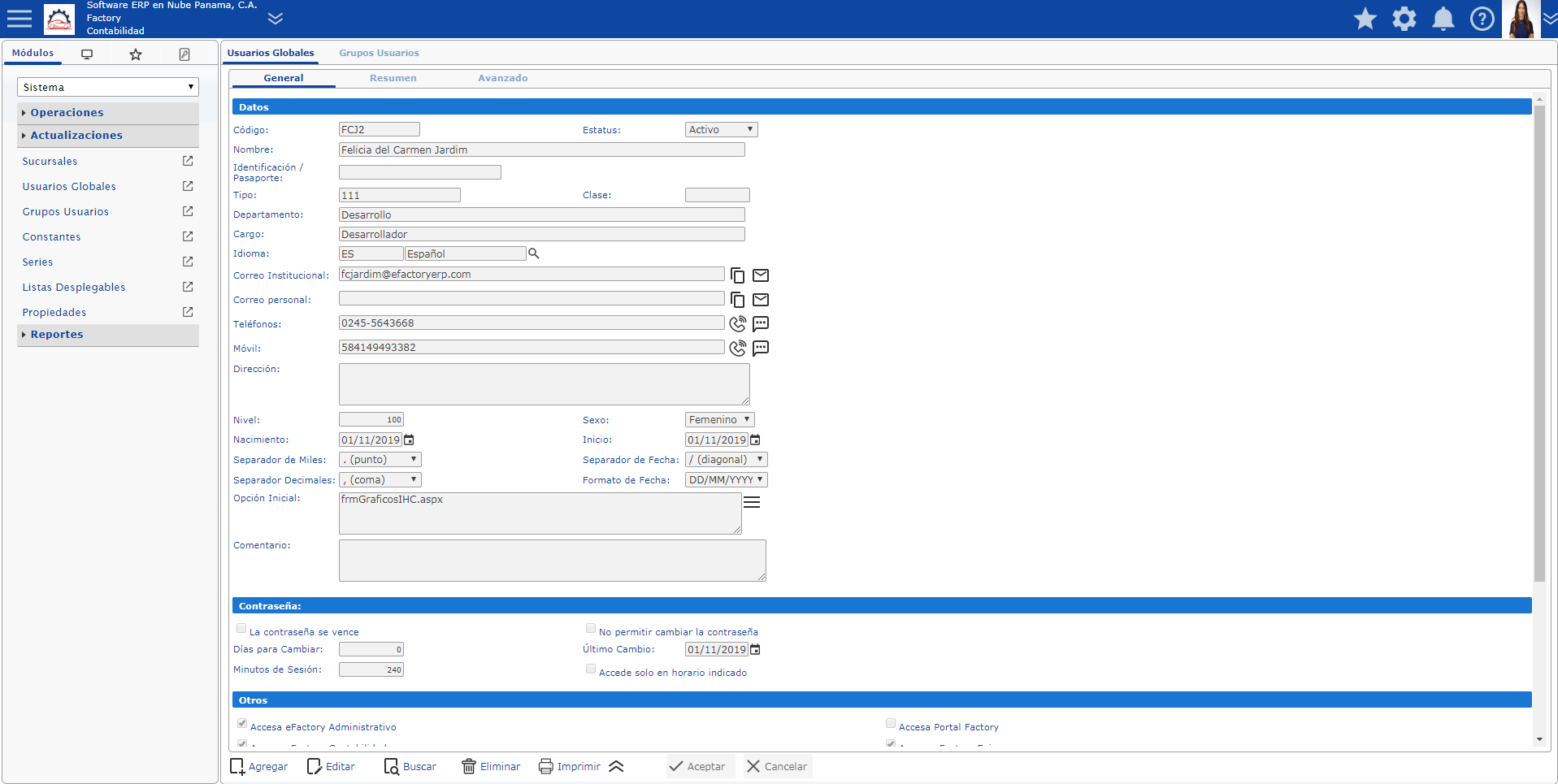b. Luego se muestra el formulario y para darle acceso a eFactory Contabilidad nos ubicamos en la Sección Otros y marcamos la casilla de Accesa eFactory Contabilidad