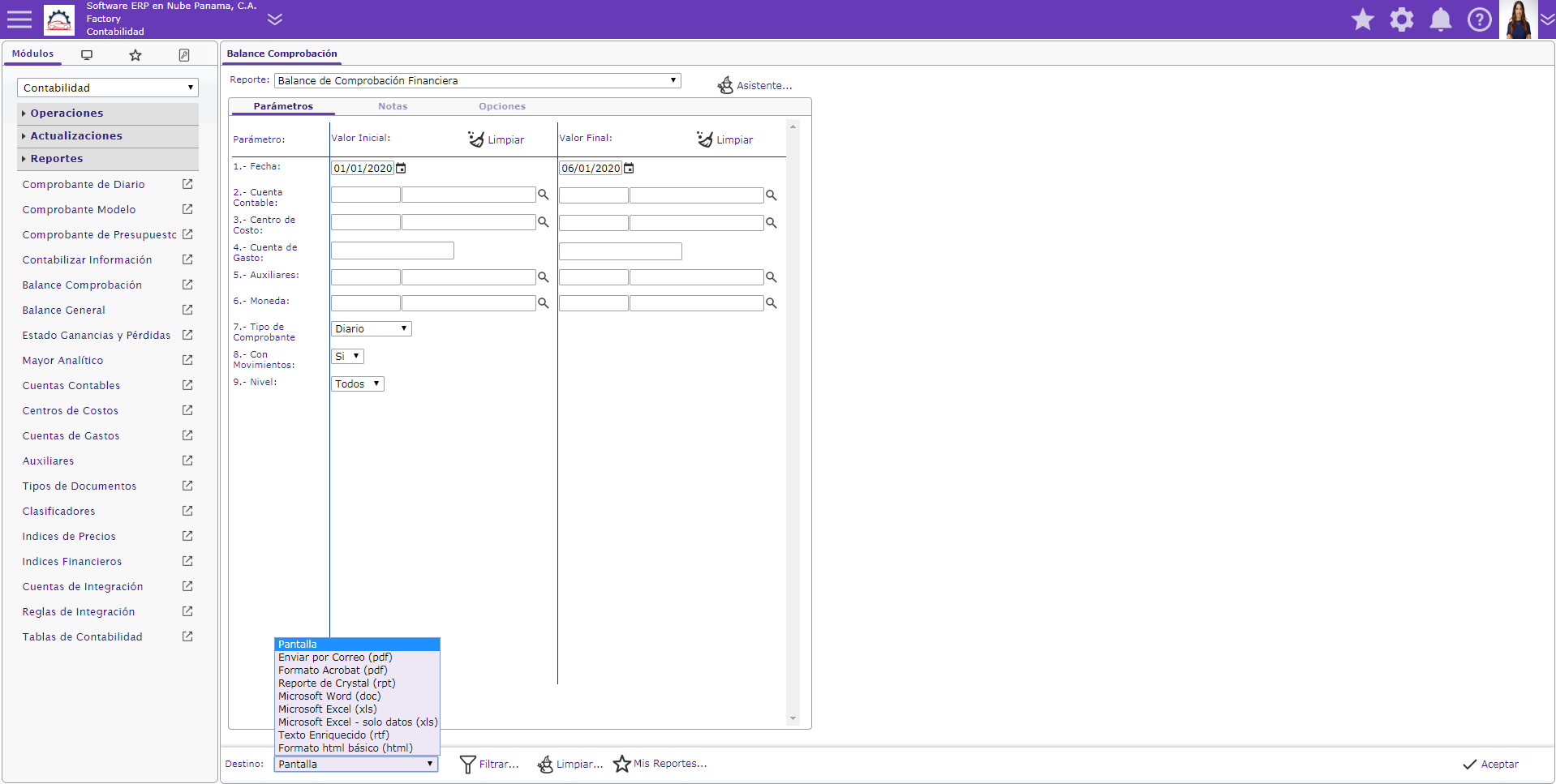 b. Para emitir un balance de comprobación financiera tenemos que ubicar el módulo de Contabilidad, desplegamos el componente Reportes, activamos el maestro Balance de Comprobación.