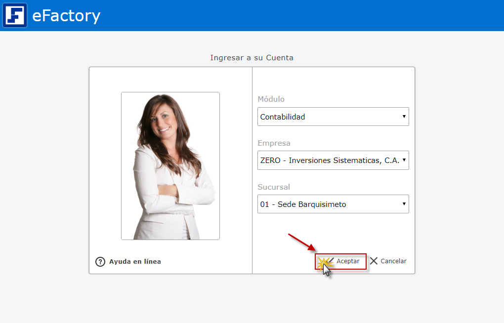 Primero debemos ingresar al sistema de Contabilidad de eFactory colocando nuestro usuario y contraseña en la pantalla inicial de eFactory, luego presionaremos el botón de "Iniciar Sesión" y seleccionaremos el sistema de "Contabilidad",