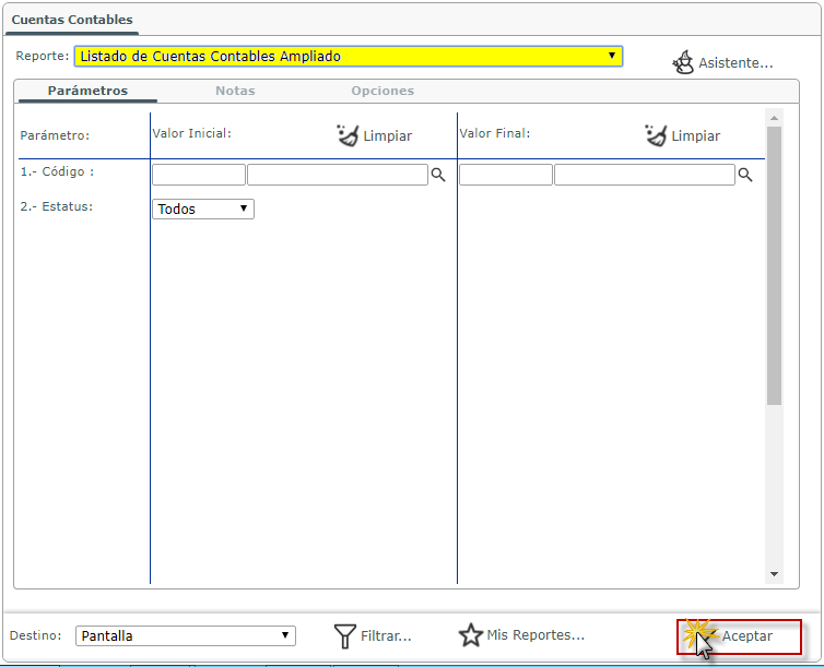 c. Después de haber seleccionado Listado de Cuentas Contables Ampliado, oprimiremos el botón de