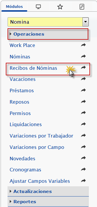 b. En el módulo Nómina, desplegamos el componente Operaciones y activamos el sub componente Recibos de Nóminas.
