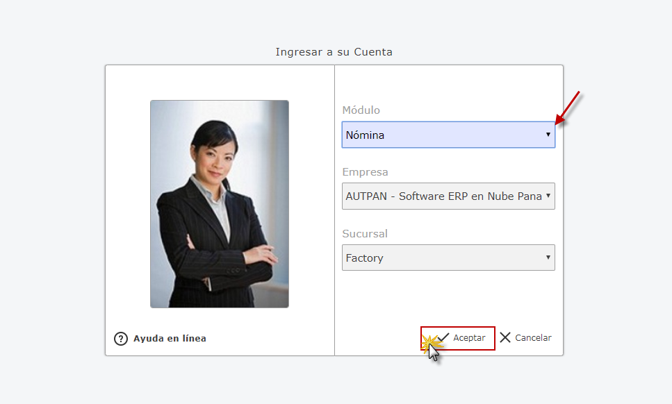 seleccionaremos el Módulo de Nómina, Empresa y Sucursal de la Empresa y presionaremos el botón