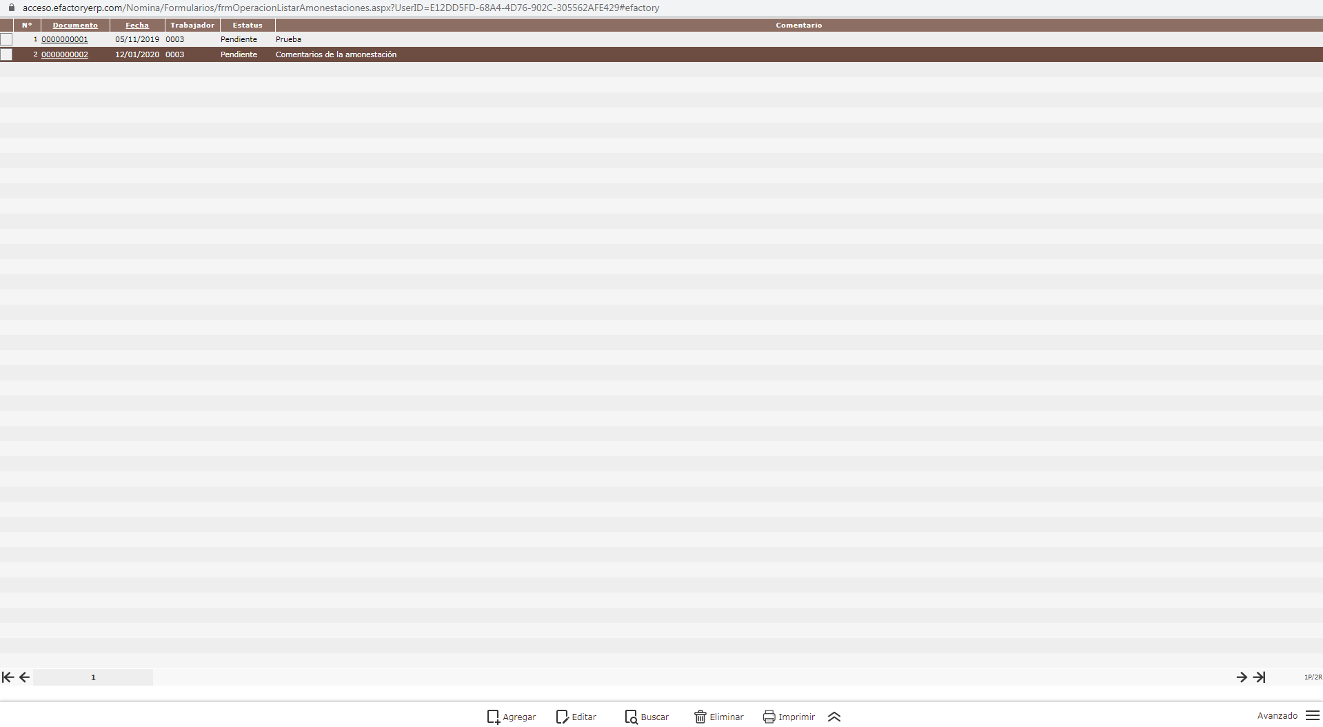 Para eliminar una amonestación tenemos que ubicar la amonestación a eliminar en eFactory Nómina y para eso la amonestación tiene que esta creada.
