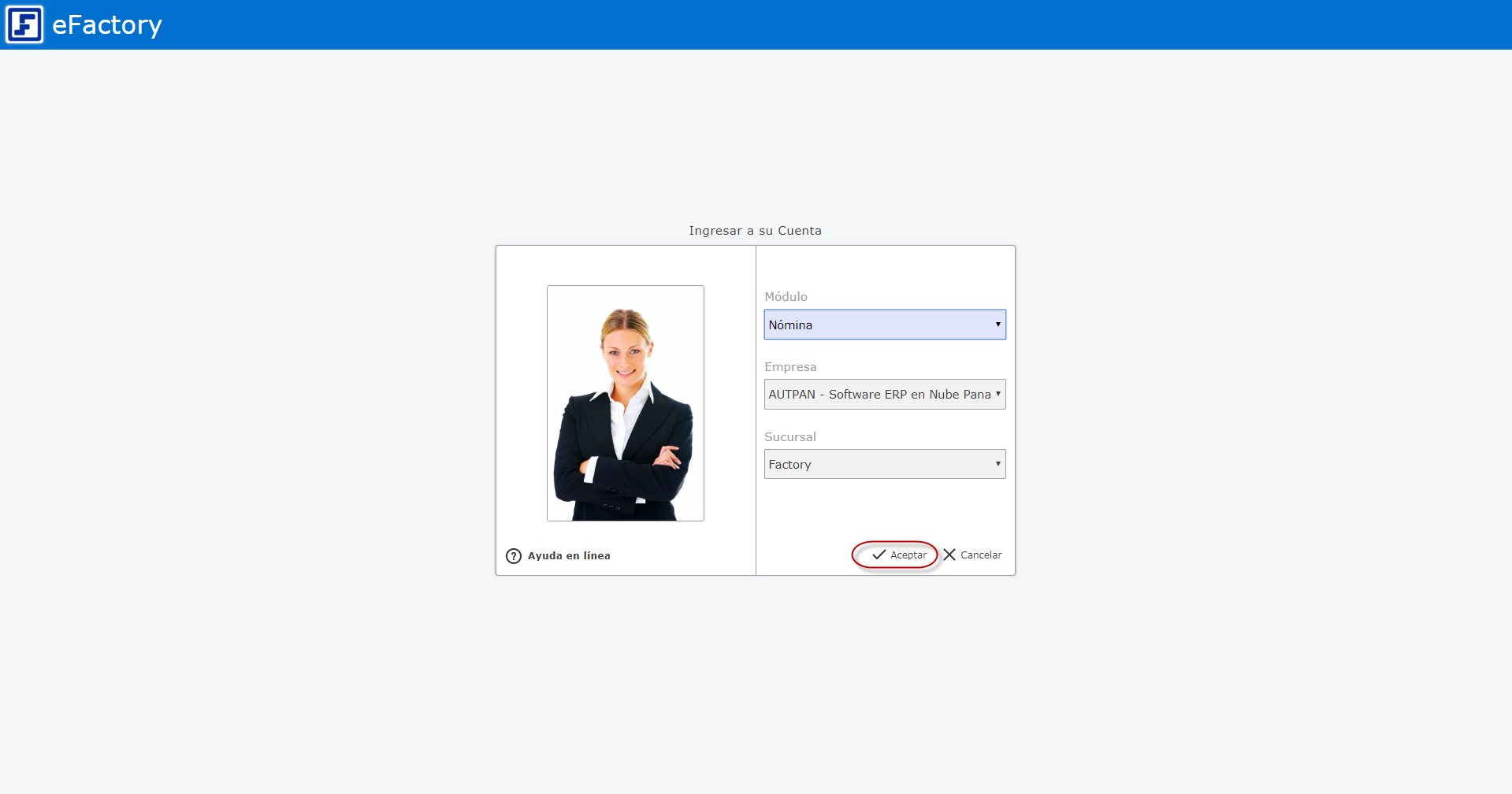 a. Para ingresar debemos iniciar en eFactory con nuestro Usuario, Contraseña, y seleccionaremos el botón