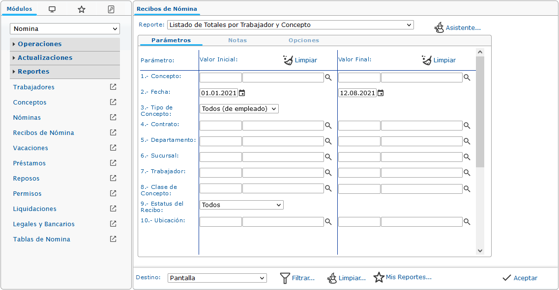 a. Luego de haber seleccionado la opción de Recibos de Nómina se muestra la pantalla donde debemos seleccionar el reporte Listado de Totales por Trabajador y Concepto, indicar las fechas de la nómina,