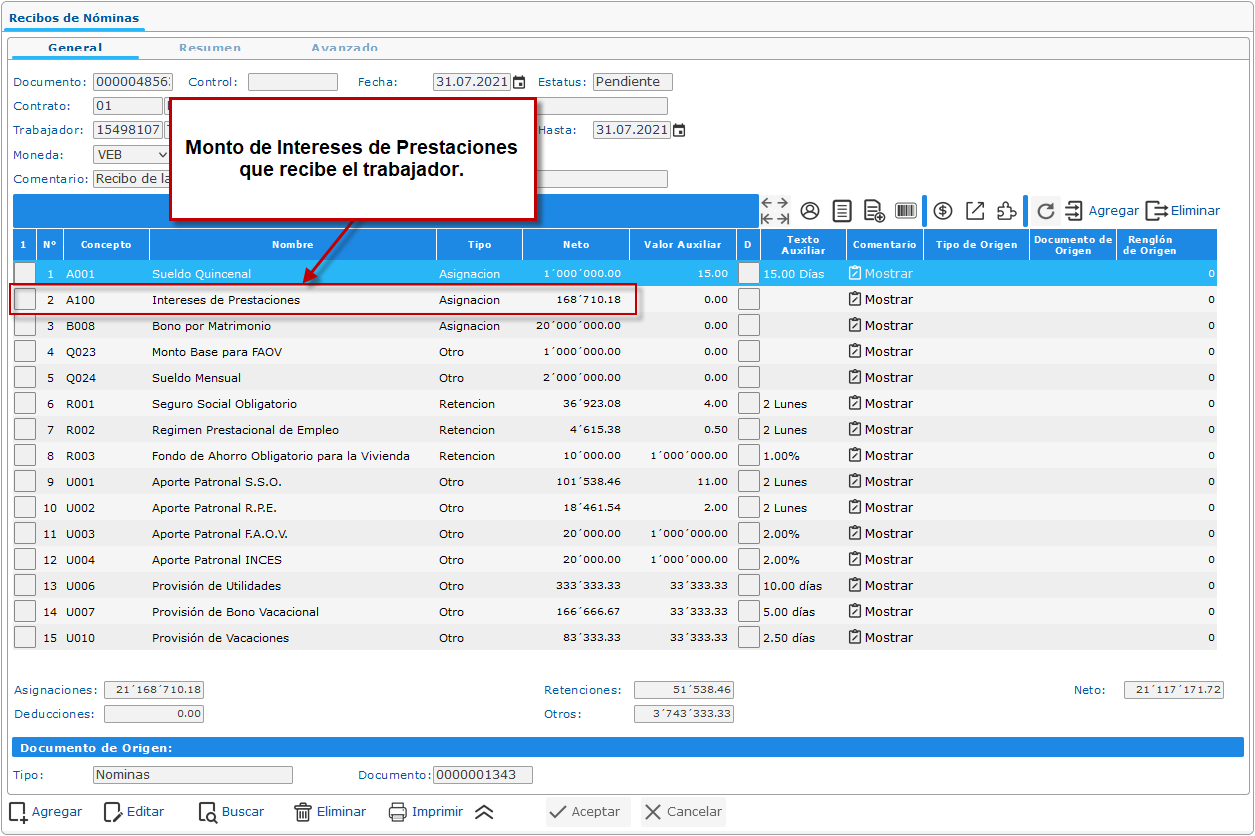 b. Seleccione un recibo de nómina generado por la última nómina y valide el monto de Intereses que recibe el trabajador.