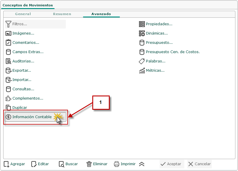 Listado de Conceptos de Movimientos con sus Cuentas Contables haciendo clic en el botón