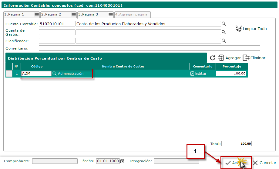 - Asignar el Centro de Costos de Ventas en la página 1.