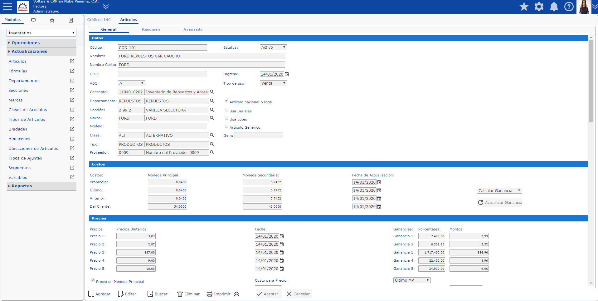 a. Al haber seleccionado el maestro Artículos nos ubicamos en la ficha Avanzados donde seleccionaremos