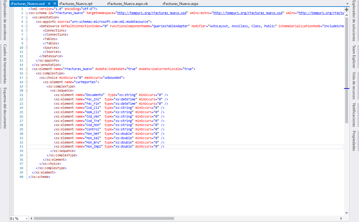 3. En el archivo .xsd: Este es el archivo en el que se definen los campos que se mostrarán en el reporte. En este archivo debe agregar o eliminar los campos que desea ver en el reporte, y asignarles el tipo de dato que traerán de la Base de Datos (dateTime, string, integer, decimal...).