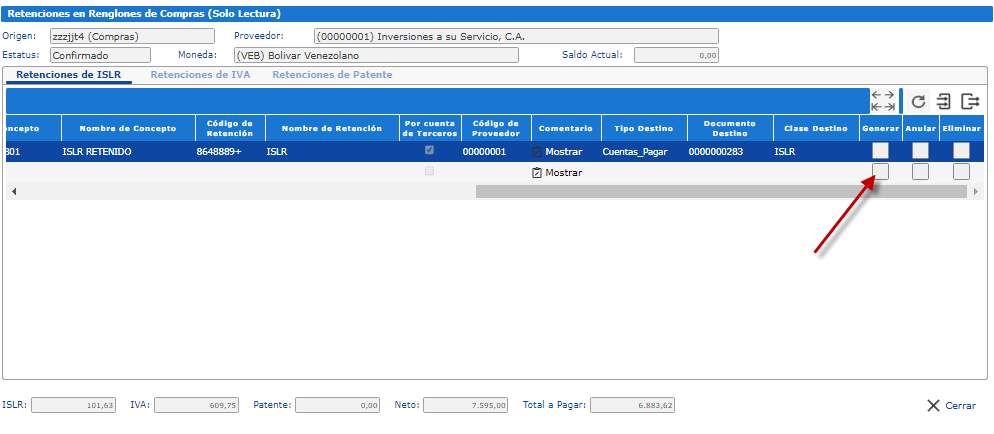d. Estableceremos el "Porcentaje de Retencion", el "Monto Sustraendo" y el "Monto Retenido" por cada uno de los renglones. Luego de esto presionaremos la casilla "Generar" para generar las retenciones por renglones.