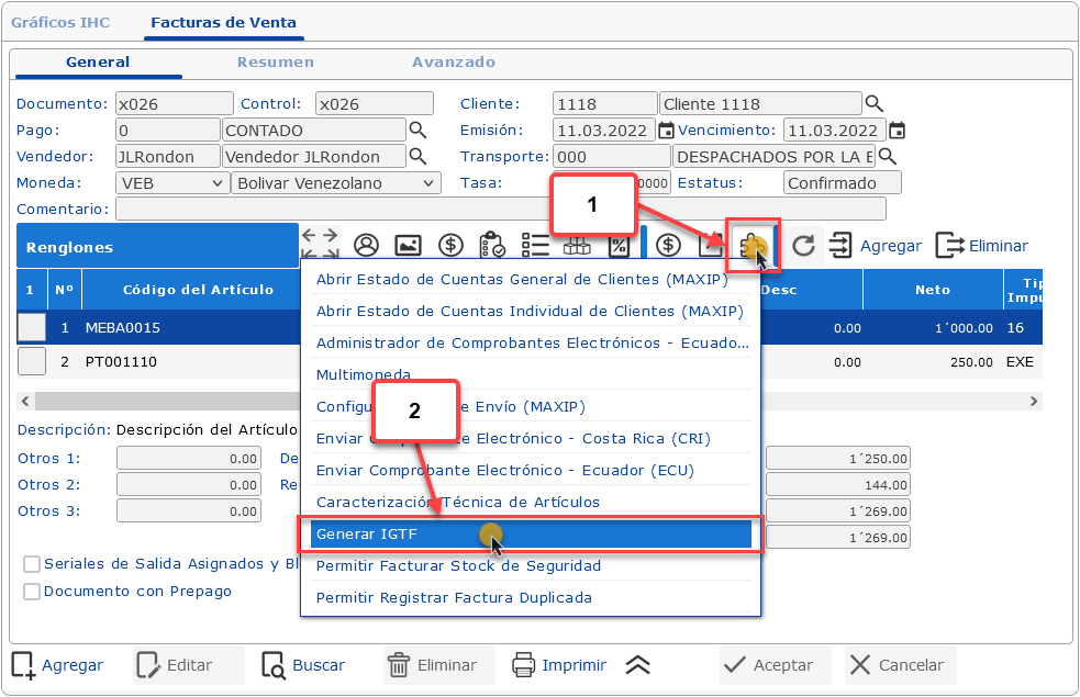 Despues de generar el IGTF de una Factura de Venta, es posible imprimir el Formato de IGTF.
