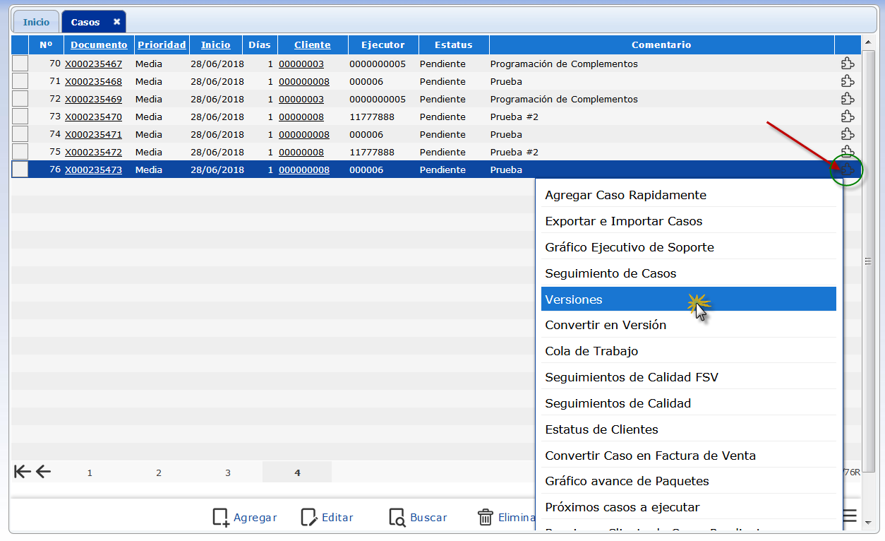 Casos, hacer clic en la última columna, la cual muestra para cada registro, un ícono de complemento