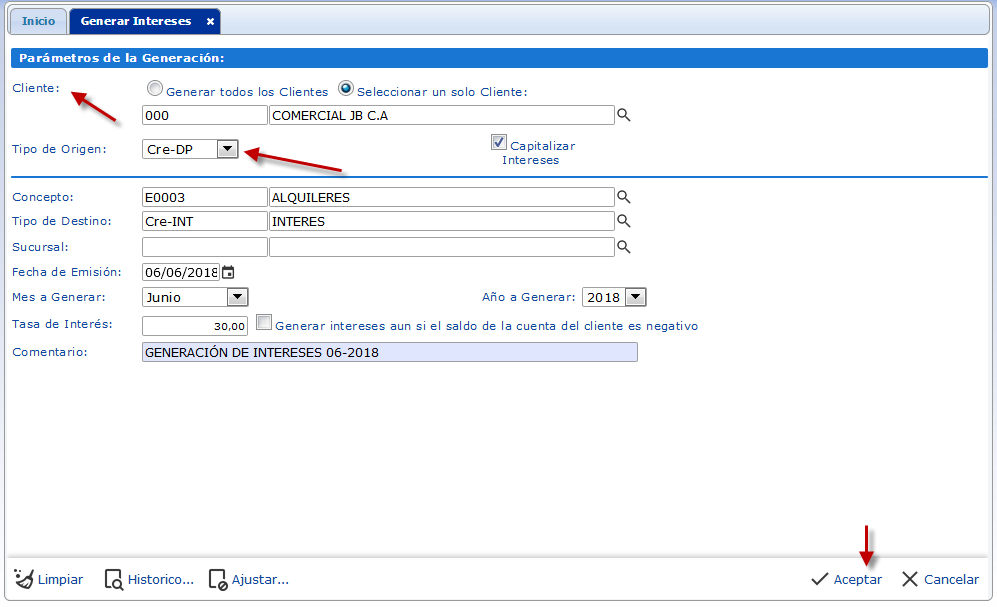 En la ventana Generar Intereses, especificamos los datos para cargar los Movimientos de Cuentas, correspondientes a los Intereses que se hayan generado por Depósitos de Clientes; Ingresamos principalmente la siguiente información: