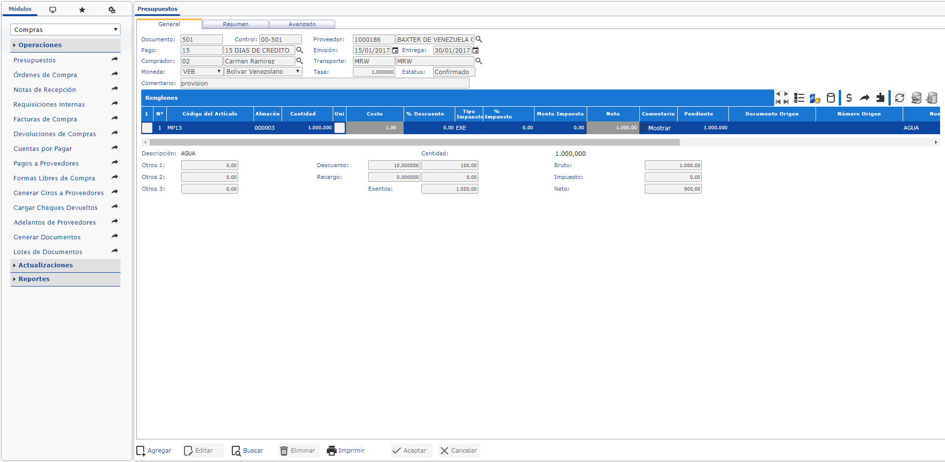 eFactory Compras te permite administrar proveedores con múltiples clasificadores, manejar el presupuesto de compras con validaciones de disponibilidades y controlar el ciclo completo de documentos desde la requisición hasta el asiento contable.